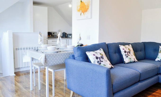 Kitchen area: Electric Oven, Electric Hob, Microwave, Slow Cooker, Dishwasher, Coffee Machine, Washing Machine. Electric central heating, electricity, bed linen, towels and Wi-Fi included. . Courtyard with garden furniture. Private parking for 1 car; additional on road parking. No smoking. Please note: There is an unfenced stream in the courtyard, 20 yards away.. 3 Old Posting Stables in a warm and welcoming cottage set in a quiet courtyard in the delightful town of Gatehouse of Fleet. An upside down house, the bedrooms are on the ground floor and are both cosy with thick carpets and comfortable beds and bedding. Upstairs the open plan living space is bright and airy with floor to ceiling windows and doors. Stylishly furnished, this really is a delightful space to spend time enjoying a few board games, watching some films together or cooking a delicious family meal.
