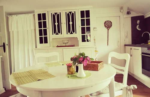 A separate kitchen with dining table and 3 chairs, refrigerator with freezer, dishwasher, coffee machine, water cooker, toaster and utensils for daily use.