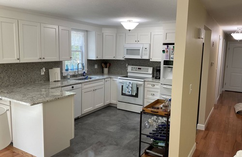 This quaint Cape-style ranch home is handicap accessible & is conveniently located near many Cape Cod attractions. The home offers 3 bedrooms (2 with queen beds, 1 with 2 twin beds). The home has been newly renovated including a new kitchen with granite countertops. Central Air conditioning will ease any hot and humid summer nights. The house is in a small and quiet neighborhood with easy access to everything the Cape has to offer. It has a spacious outdoor area which can be viewed from the large deck (14’x24’). There’s plenty of room for outdoor dining, cooking on the propane grill, or just enjoying the large yard. Relax by the fire-pit surrounded by inviting chairs, and enjoy the wooded views surrounding you. A shower in the extra large outdoor shower is an experience you will relish. It’s not only roomy but convenient for rinsing off that salt water! Inside, this lovely home away from home offers a cozy living area where you can unwind and relax after a terrific day exploring the Cape. Snuggle up on the sofa and watch your favorite show on the smart TV with streaming services, or just enjoy the WIFI. If you’d rather unplug….light the candles in the fireplace and enjoy the tranquility. The deluxe indoor shower boasts a rain shower head as well as a handheld sprayer and granite seating. The new kitchen is complete with all the equipment you need to prepare family meals, lobster cookouts, cake decorating, and even drink umbrellas. First floor level washer/dryer for your laundry needs.
