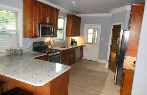 It has been totally updated with granite and marble counters and stainless appliances. It has updated baths with a walk-in glass shower. It has a fully equipped kitchen and super comfortable beds. There is free wifi and premium stations on Directv. As well as a full size washing machine and Dryer.There is a screened in front porch and a New Orleans style courtyard for relaxing or grilling in the afternoon.