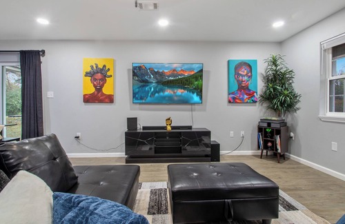 vibrant, artistic living space that’s perfect for creative individuals or families looking for a unique and modern stay. The highlight is a bold, colorful mural wall that adds character and energy to the room, paired with sleek black vegan leather furniture for a chic, comfortable vibe. The open-concept layout leads seamlessly into a stylish kitchen, complete with modern appliances. Ideal for those seeking a lively and stylish retreat.