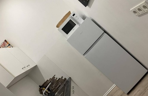 The kitchen is equipped with an oven, as well as a coffee maker, an electric kettle, and a microwave. And you can even pack a bit lighter because there's a washer and dryer.