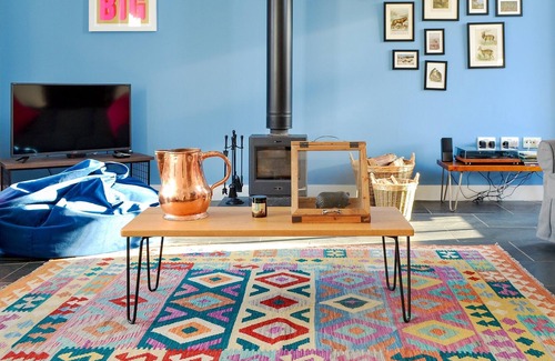 Living area: With open fire, wood burner, Netflix, Smart TV and patio doors leading to gravel yard.