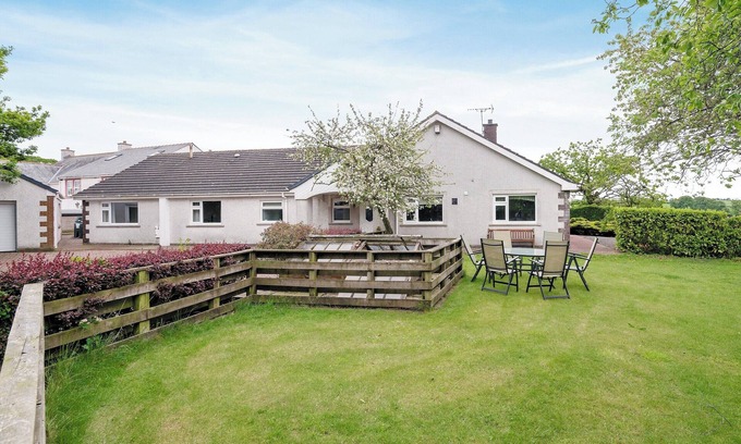 Bathroom: Jacuzzi Bath, Cubicle Shower, Toilet. Biomass central heating, electricity, bed linen, towels and logs for wood burner included. Patio with sitting-out area, garden furniture and barbecue. Hot tub (private). Sauna (private). Private parking. No smoking. Please note: There is a fenced pond in the garden.. This spacious holiday bungalow is well furnished and equipped with good facilities. There is an excellent ratio of bedrooms to bathrooms plus the hot tub and sauna help provide accommodation which is suitable for friends and families to relax and share in comfort. The biomass boiler provides eco-friendly heating. Peacefully situated in the small hamlet of Langrigg, next to the owners’ mixed farm, the holiday home is ideally positioned for exploring the North Western Lake District and the Solway Coast, 10 miles, which is well known for its golf courses. Wonderful walks, cycle routes and stunning scenery abound with much to interest historians, ornithologists and outdoor enthusiasts. The interesting, traditional market town of Cockermouth with its William Wordsworth connection and the popular, bustling lakeside town of Keswick are both about a 20 minute drive. The border city of Carlisle is a few minutes further along with Hadrian’s Wall and Scotland. Shop 2 miles, pub 1 mile.