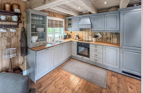 Located between Gol and Hemsedal, this charming wooden house welcomes you with a beautiful combination of comfort and nature experience. Inside the house you will find a cosy and stylish interior. The spacious living room with its light-coloured wood panelling and large windows offers an inviting space to relax together. Dine together at the dining table in the living area and plan your next adventures. The open-plan kitchen is equipped with modern appliances and blends harmoniously into the rustic ambience of the house.
