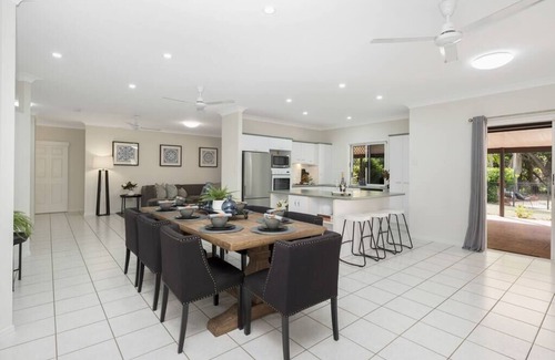 Immerse yourself in the tropical charm of Queensland with a stay in this spacious, single-level home nestled in the tranquil Bushland Beach neighbourhood. This executive property features a seamless open-plan design and a generous outdoor area that leads directly onto the beautiful beach. Add to this a large outdoor swimming pool, and you have the perfect setting for families or groups seeking a leisurely retreat. Enjoy the blend of beachside living and modern luxury in this tropical paradise.
