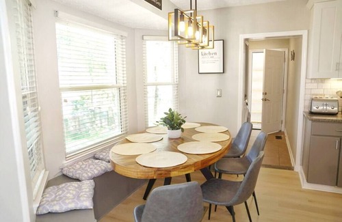 This stylish stay is perfect for group trips. Easily sleep 10 people to the King, Queen, and single sized beds with another 1 or 2 on the sectional. The home boasts soaring ceilings in the main room and wonderful natural light in all rooms. The incredible backyard can be converted into an event space. Games, TVs, newly renovated bathrooms, and even a meditation room—its the perfect reunion house for your friends and family. Home is located 17 miles/27 mins from Broadway.
