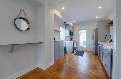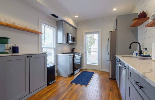 As you enter Unit A you will be welcomed into the living space with a sofa and smart TV with streaming capabilities. Off the living room is a newly updated kitchen with quartz countertops, beautiful grey kitchen cabinets, and brand new stainless steel appliances. There is also a half bathroom located off of the living room and kitchen. Through the kitchen you will find the back door that leads to Unit A's private back porch area. The second floor of Unit A features two bedrooms; a Primary bedroom with King Bed, second bedroom with Queen bed, and a newly updated full bathroom with countertop space and large mirror perfect for getting ready for your day! Located in the 2nd floor bathroom is also a washer and dryer.