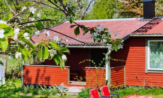 A warm welcome to a charming cottage surrounded by greenery and leafy apple trees. Outside, sheep and lambs graze, a true idyll. The cottage is located in the middle of the beautiful Valle area, which is known for its dramatic landscape with sparkling lakes, fine hiking trails and thousands of cherry trees. The area is particularly well-visited during the month of May thanks to the thousands of cherry trees in bloom, a fantastic experience! You are welcomed by a large garden with barbecue area above the house with an old stone fenced yard around the plot. The house is homely with elements of classic Swedish style from the 70s. The hall is spacious with space to hang up outerwear. The hall and living room are integrated with open space. There is a stove here that crackles a lot on chilly evenings. Directly to the left is the house's one bedroom with an extra bed for 2 people. Bed linen is not included. Straight ahead, the small charming kitchen opens up and to the left is the house's second bedroom with 2 90 cm beds. The living room is bright with large windows facing the garden. Here are sofas, an armchair and a TV corner. There is also a dining table with plenty of room for the whole party. In the guest cabin at the back of the plot there is two additional beds for two people. There is room for 6 people in total and your accommodation is perfect for a family with children or a couple. Between the guest cabin and the house itself is the toilet, which is a composting toilet . All furnished in a very charming style. The shower is an outdoor shower with curtains and with the bare sky as a roof and the birds as company. There is only summer water, there is no hot water. Final cleaning is not included. The service cannot be purchased. This accommodation is close to Skara sommerland if you are a family with children. If you are also interested in history, a visit to Varnhemskloster is recommended or take a trip to Naturum Hornborgarsjön for a fantastic nature experience.