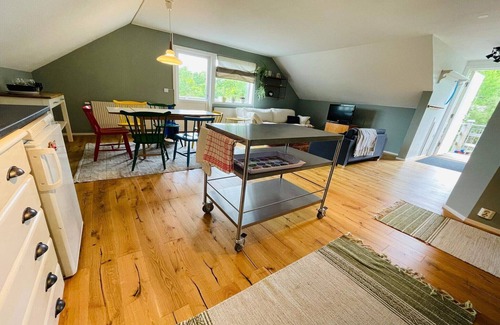 Rural gem on Orust – with nature outside the door and the sea around the corner Welcome to a charming apartment surrounded by horse pastures and lush forest groves – perfect for those who want to enjoy a quiet, rural atmosphere with proximity to both salty baths and lively small towns on beautiful Orust. The accommodation is located on the second floor, above a garage, with its own entrance via the stairs next door. Here you live undisturbed with a private balcony where your morning coffee tastes extra good with a view of the forest and land. The homeowner lives in the villa on the property, but you have your own part to land in. Bright and open – space for rest and socializing The apartment has an open plan with kitchen, dining area and living room in one. The simple kitchen is equipped with a stove, oven, fridge with freezer compartment and microwave – everything you need to cook a good dinner after a day of adventure. The dining area has colorful chairs that set a cheerful tone, and the living room has two sofas, one of which is a sofa bed for one person. There are two bedrooms, one with a double bed (170 cm) and one with a single bed (80 cm). The bathroom is fresh with a shower, toilet, sink and plenty of storage. The Göksäter discount department store (10km) is a great destination for those who love shopping. Discover Orust – an island full of gems The accommodation is an excellent base for discovering the charm of Orust. A short drive away are the communities of Varekil and Ellös, where you will find grocery stores and services. Take the opportunity to make an excursion to Morlanda – a real favorite with a cozy café, market garden, small shops and a good restaurant environment. For golf enthusiasts, Orust Golf Club is a given stop – beautifully located and with a restaurant that serves lunch with a view. Swimming, hiking and archipelago fun The nearest beach is about 3 km away, and within a short drive you will also find Hälleviksstrand – an idyllic place for a full day of swimming, ice cream and rocks. In Nösund there are several beautiful hiking trails in scenic surroundings, and during the summer there are often activities for children such as swimming school and sailing school in the area. Take the car to Tuvesvik and hop on the ferry to Käringön – a classic on the west coast. Here you will find salty dips, delicious fish restaurants and charming alleys. Perfect for a day trip. Welcome to land, breathe out – and experience Orust at its best!