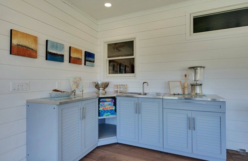 - Large, screened porch with comfortable seating + additional outdoor dining table + kitchen efficiency cabinets with a sink and kitchen pass-through window