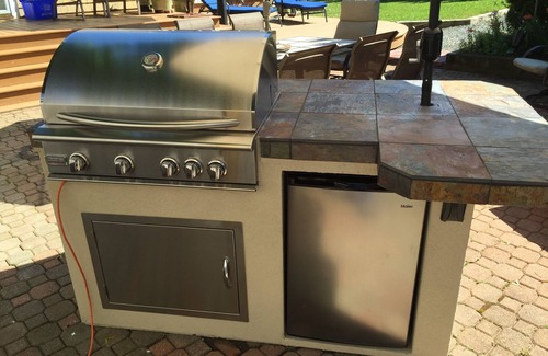 This ranch-style remodeled home is complete with bricked patio, large deck, sliding glass doors to decking. Outdoor lounge furniture and seating at tile table for 8-10 people. Awesome permanently wired out door gas grill. Indoor fireplace for colder months.