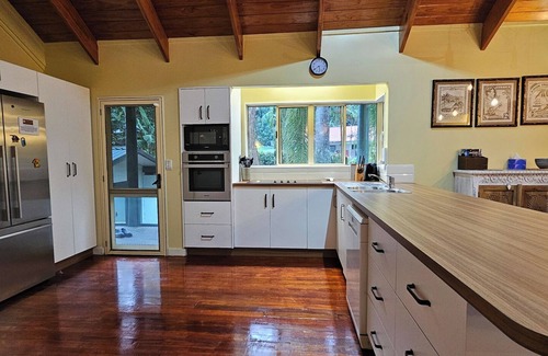 The lodge offers 5 bedrooms, 3 living areas (one with 2 single beds) with kitchen, 4 bathrooms (3 showers and 1 spa bath), and an inviting inground pool for exclusive use. Comfortably sleeps up to 14 guests in 4 king beds (which can be split) and 6 king singles. Additional sleeping arrangements for children can be made upon request, and a porta-cot is also available.
