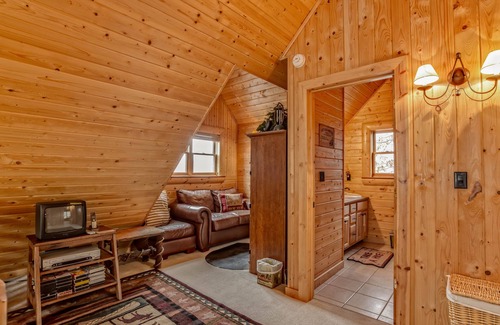 The cabin offers 5 bedrooms which includes a bunk room with two bunk beds. The cabin can easily accommodate two separate families as the lower level offers one bedroom plus the bunk room, an efficiency kitchen and family room. The cabin has two (2) High-definition streaming televisions. The lower level has a laundry room and full bathroom. The main level has another family room with stone hearth wood stove, master bedroom and bath, and kitchen/dining area. The upper level has two bedrooms, bathroom and open loft area. The loft area also provides a small office area.