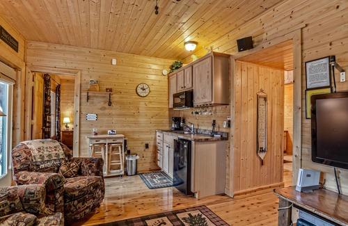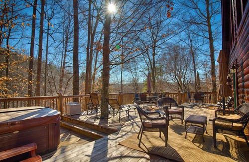 The cabin itself is decorated in rustic elegant décor, beautiful Australian Cypress hardwood floors and stainless-steel appliances. The covered front covered porch offers rocking chairs to relax while the large 30-foot X 60-foot open deck offers a 6–8-person hot tub, two patio sets and a wicker seating area with a large shade umbrella. Warm up in front of a fire, relax in the log swing alongside the on-site creek, or read a good book in the hammock. Plenty of room for the children to run, play croquet or catch fireflies.