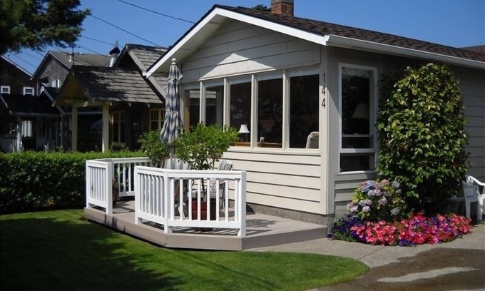 Our cozy Cannon Beach house, in the presidential area west of Hemlock, has a small peek of the ocean . We have a back yard with a bar-b-que and small sitting area. The front deck just right for reading a good book, eating, or or having a cup of coffee. and has a table with chairs. There is another table outside close to front door. The beach is at the end of the street.