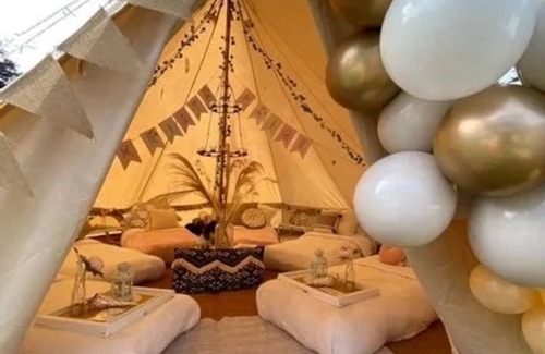 Each luxury glamping tent is in a beautiful location tucked right under the trees. We are blessed to have a massive eagle's nest located on the property. You will be able to view them and hear them sing several times a day, from the luxury of your tent. The bell tent can be arranged in several ways.