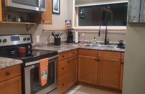 This space is a 2-bedroom 1 bath downstairs apartment with a full kitchen stocked with pots, pans and assorted cookware. Many other small appliances and specialty cookware are available on request (stand mixer, slow cooker, air fryer etc.).
