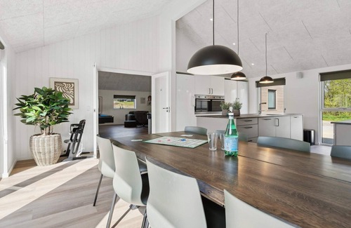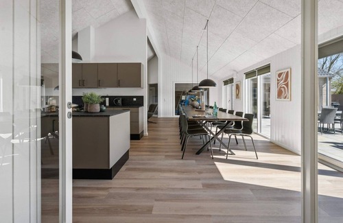 A Luxurious Holiday Experience at Skåstrup Strand. This house is the perfect choice for large families and groups of friends looking for an unforgettable holiday experience. Located by the beautiful Skåstrup Strand in Northern Funen, this spacious holiday home offers a unique combination of luxury, comfort, and a wide range of amenities for both relaxation and active entertainment. With its proximity to the beach (only 500 meters) and the charming town of Bogense (8 kilometers), the house is an ideal base for exploring the scenic surroundings and attractions of Northern Funen. The house offers plenty of space with a capacity of up to 24 people, spread over 8 bedrooms and a spacious loft. Two of the rooms are designed as family rooms with a double bed and a bunk bed, while the remaining rooms have two single beds that can be joined to form double beds as needed. The four bathrooms ensure comfort for all guests. The heart of the house is the large, well-equipped open-plan kitchen and living area, perfect for communal dining and cooking. Here you will find two ovens, two dishwashers, two refrigerators, and a wine cooler, making cooking easy regardless of group size. The large common room invites cozy moments and togetherness. This house offers a wealth of activities for all ages. The private pool area with water slide and volleyball net is a guaranteed hit. After a refreshing swim, you can relax in the sauna or the outdoor hot tub. For the more active guests, there is a game room with billiards, table tennis, darts, shuffleboard, and table football. Evenings can be enjoyed with movies on the large flat screens, complemented by a Sonos surround system. Outdoors, you can enjoy the large terrace with lounge furniture and an outdoor dining area, perfect for summer evenings with grilled food and good wine. Children can play on the trampoline, swings, or in the sandbox. The garden is fenced, providing a safe environment for both children and pets. A smaller terrace offers a beautiful sea view, ideal for morning coffee or a glass of wine at sunset. Please note that the pictures are demo images, as the house is under construction. The finished house and outdoor areas may therefore differ from the demo images. Construction noise may occur in the area.A refundable deposit might be charged closer to your check-in date. Thesecuritydepositensuresasmoothstayandcoversany additionalservicesorconsumptioncharges.Thisdepositcoversutilitiesconsumedduringyourstay andanyadditionalservicesthatmaybetaken.Thefinalamountwillbeadjustedbasedonactualmeter readings,actualusageofextraservices,andanyremaining balancewillberefundedwithin21daysaftercheckout.Thisdepositsimplyactsasaprepaymentforchargesthat youwouldanywayspayfor,ensuringaseamlessstayand check-outexperience.