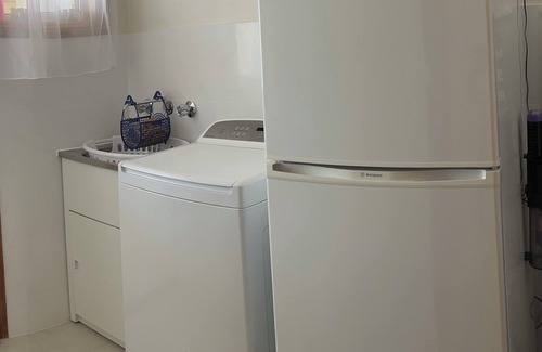 The laundry has a trough, top loading washing machine, 2nd fridge/freezer, iron, ironing board, Stick vacuum cleaner, broom, mop & bucket.