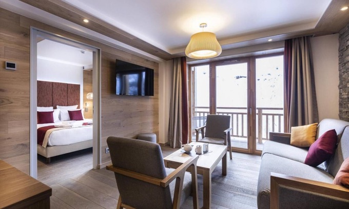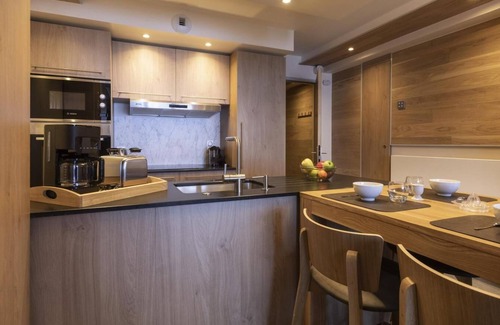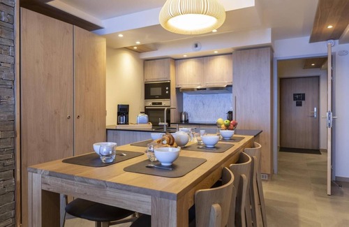 The residence Les Balcons Platinium Val Cenis***** promises a restful and relaxing stay in the mountains, in the heart of the Vanoise National Parc. The residence is ideally located in the heart of the village of Lanslevillard and nearby ski area and shops. This upscale and elegant residence blends in perfectly with its surroundings: stone cladding, larch cladding and plaster typical of Haute Maurienne. The 25 very spacious apartments can accommodate from 2 to 16 people and offer luxury equipment for an even more pleasant stay. Benefit from free access to the relaxation area with swimming pool, sauna, hammam, fitness area, paddling pool, jacuzzi. Surface area : about 65 m². Living room with bed-settee, stove. Bedroom with bath-tub, shower, double bed, WC. Bedroom with shower, 2 twin beds. Kitchenette with special heater to prepare La Fondue, special heater to prepare La Raclette, kettle, 2 coffee machines (filtre et Nespresso Magimix), Wine cellar, multi-function oven, toaster, dishwasher, microwave, induction cooking rings, fridge-freezer. Bathroom with bath-tub, WC. Separated WC. Balcony.