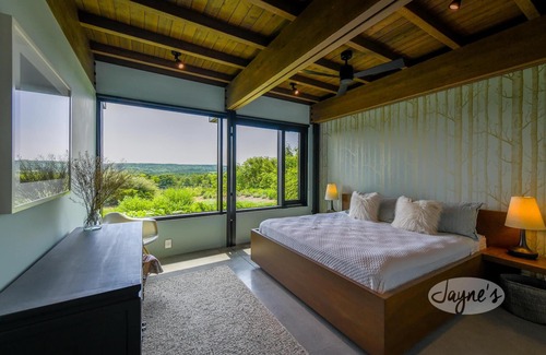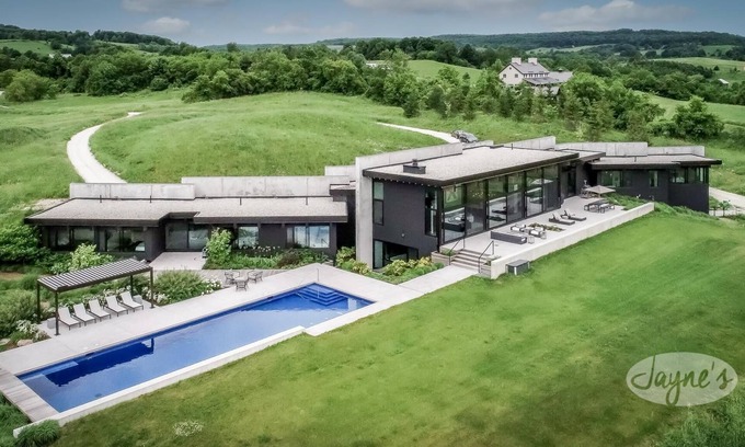 BUNKER RIDGE FARM - Arrive via a long driveway that winding through a hayfield to the most elaborately designed property you have ever laid eyes on! The flat, minimal concrete exterior will have you jumping out of the car before it is parked to race inside and discover what is inside this unique architectural design. From the moment you walk through the grand doors you will discover a tastefully furnished modern home with grand pieces of unique art that adorn the walls. The round about driveway leads to the left of the house where a garage access is offered. To the right, the main entrance is hidden within the walls. Around back, a sprawling concrete deck seamlessly extends off of the house, boasting a pizza oven, BBQ, dining table with umbrella, 2 chaise loungers, a lounge area with a sofa and 2 accent chairs surrounding a gas fire pit. Descend down 4 stairs to the picture perfect 65ft pool extending in front of a cabana with 5 loungers inviting you to bask in the sun while soaking in the view. A conversational set for 4 is off to the right of the cabana as well as a hammock, offering a peaceful place to enjoy an afternoon siesta! Descend further down to the hot tub area located off the fitness room which is the ideal place to relax with a glass of red as the sun goes down!