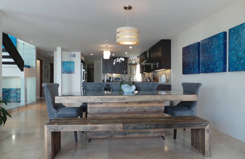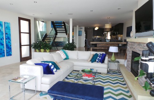Paradise on The Strand is by far the most spacious vacation rental in Oceanside with 5,168 square feet of contemporary style architecture beautifully furnished and decorated and just across a one-way street from the beach. The endless ocean views will mesmerize you. The best view of all may just be on the rooftop deck while soaking in the 6 person Caldera spa listening to your music through the Bluetooth capable speakers. It's the perfect spot to watch the sunset or turn on the fiber optic lighting after dark for ultimate relaxation. Featuring custom paintings by local Oceanside artist Mark Jesinoski, the house welcomes you with splashes of color inviting you into the oceanfront retreat. The 2 story glass windows and skylights throughout allow the sun to illuminate the house by day and the smart house technology gives you additional lighting and shade controls at any time to create moods or privacy at the push of a button. The security system has key-less coded entry and every suite has hotel-style safes for peace of mind. With plenty of energy-generating solar panels, this Eco-friendly house also has an Electric Vehicle charging outlet in the garage. In the front of the house, a private sandbox awaits for kids or adults alike that want to feel the sand in their toes. The toy closet is full of beach toys, boogie boards, chairs, umbrellas, and more.