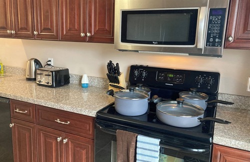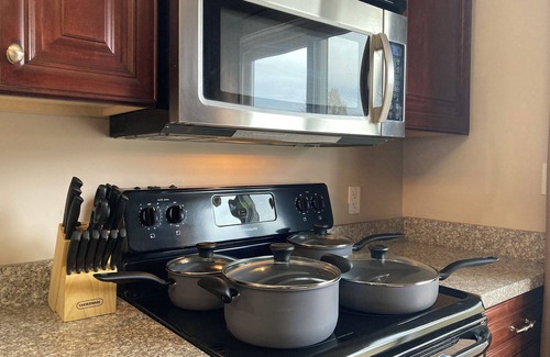 * Kitchen: Our fully stocked kitchen is perfect for long-term stays! Cook your own delicious meals. Loaded with pots, pans, plates, mugs, bowls, utensils, condiments, and cooking and baking supplies.