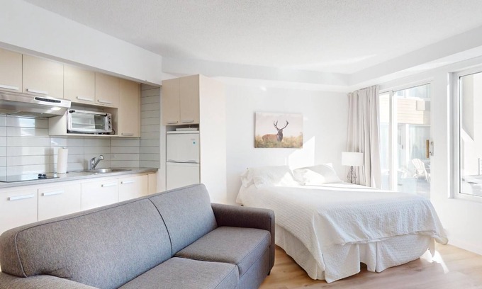 Bright, fully renovated studio located at the foot of Mont-Sainte-Anne, sleeps up to 4. The studio includes a Queen-size bed and a double sofa-bed. It also includes a kitchenette with everything you need for cooking.
