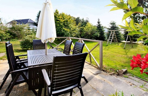 Layout: open kitchen(cooker(electric), hood, coffee machine, microwave, dishwasher, fridge(+ freezer), tumble dryer, washing machine), Living/bed room(40 m2)(TV(satellite, german television channels, danish TV channels (DR1 and TV2)), radio), bedroom(double bed, high chair), bedroom(double bed), bedroom(double bed), bathroom(floor heating)(bathtub or shower, washbasin, toilet), bathroom(floor heating)(washbasin, shower, toilet), conservatory(25 m2), Bubble bath(indoor, heated, 4 persons), sauna(indoor, heated, 3 persons), heating(electric), terrace, garden furniture, air to air heatpump