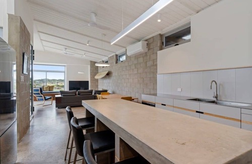You are greeted by a nice wide entry hall and once inside you’ll discover a very modern, spacious & lovely kitchen with concrete island bench and stools. There is a separate pantry with wine fridge and washing machine. The kitchen consists of a fridge/freezer, electric cooking, microwave, dishwasher and ground coffee bean machine. There is also a dining area to seat six and an open plan lounge room with large glass windows to let the afternoon sea breeze in.