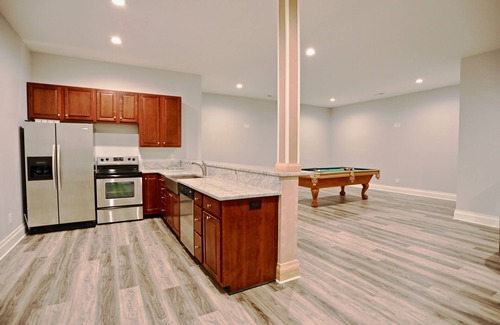 The basement features a full kitchen, full bath with shower, pool table, lounge area for watching sports and movies, and a sofa pull out bed.