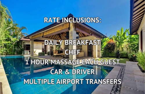 The rate INCLUDES amazing value benefits including daily breakfast, full-time private chef, multiple airport transfers, FREE 1 hour massage for each guest, 8-seater car & driver at your service daily at the villa, etc. See below for full list.