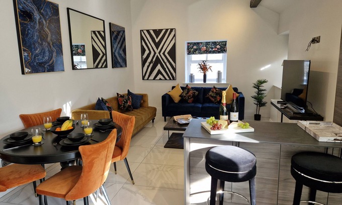 The Hamilton is a multi million pound development and is a grade 2 listed building which dates back to the 1600s. The development now consists of 6 high end luxury apartments in the main residence and three high end barn conversions to the courtyard. The majority of the original features have been kept and restored and which was a high importance to the British heritage report. The living areas in this single-storey home consist of an open-plan living space with kitchen equipped with oven, hob, microwave, fridge/freezer and dishwasher, a communal utility with washing machine, and a sitting area with Smart TV. There is one super-king-size bedroom with Smart TV and ensuite bathroom, and one double bedroom with Smart TV, serviced by a bathroom. Outside there is an enclosed rear garden with patio, lawn, furniture, and off-road parking for three cars. Within 0.5 miles you will find a shop and a pub. One well-behaved dog welcome. Please note that this is a non-smoking property. WiFi, fuel, power, bed linen and towels are all included in the price. For a wonderful base in Preston, book 7 Holly Barn