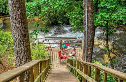From this deck, step onto a wooded trail winding down to the riverside and waterfall. Lay directly in the falls, relax in the water, or simply enjoy the sounds and scenery! There is also a mountainside staircase leading to an observation deck which provides a beautiful full view of the large waterfall on the south side of the Inn. BTW: No need for bottled water, our drinking water is EXCELLENT!