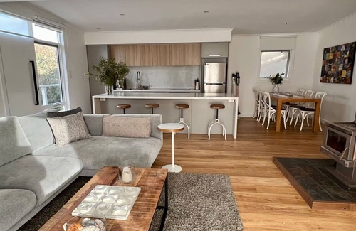Inside, the living area features a large TV, DVD player and iPod dock to entertain the family. The dining table can accommodate up to 8, while an additional outdoor dining setting and four burner flat plate BBQ are on the deck for al fresco meals. Ceiling fans and a wood heater are also in this area of the home to ensure it stays comfortable year-round.