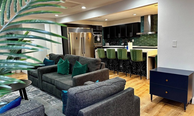 Welcome to The Peacock Inn by vegas-bnb, a spacious retreat, offering approximately 3,200 sqft of indoor opulence and 2,000 sqft of outdoor entertainment on a half-acre lot. Upon arrival, our spacious living room welcomes you with 3 sofas, 3 chairs (seating 9), an 85-inch TV, and a dining area for 8, complemented by countertop seating for 4. The modern kitchen, equipped with dinnerware for 18 and all essential cooking and bakeware, ensures a delightful culinary experience.