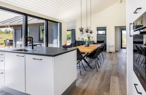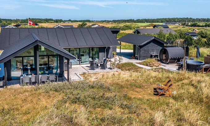High-quality holiday home with outdoor hot tub and sauna for relaxing hours. The house has a lovely terrace area and is located by Tornby Strand. Here you really have the opportunity to spend a great and relaxing holiday at any time of the year. The holiday home is situated on a large, hilly natural plot with cosy corners where you can enjoy the beautiful nature in peace. The house is modern and tastefully furnished. It has a spacious entrance hall with space for outerwear and shoes as well as a washing machine and tumble dryer. From there you also have access to one of the house's two bathrooms as well as the spacious and well-equipped eat-in kitchen with large windows that provide optimal sunlight throughout the day and direct access to the terrace area. There are also four bedrooms with storage space, which are well located. On the large plot there is plenty of space for children to play and the best conditions for enjoying a holiday. In addition to the sauna barrel, there is both an outdoor shower and a hot tub on the terrace, so you can look forward to a dose of wellness in the open air. The outdoor hot tub for 6-8 people is heated with firewood. The outdoor hot tub is closed from 01 November to 31 March. If you wish to use the outdoor spa during the winter, it can be arranged for a fee of DKK 500.00. However, use of the outdoor hot tub during the winter period must be ordered prior to arrival. A huge terrace landscape stretches out to the south and west. The terrace area offers both screened, covered and completely open areas. There is a play frame with climbing wall, slide, swings and a sandpit for the children. Garden trampoline can only be used at your own risk. Sink/filet bench with water outside. No letting to youth groups desired!A refundable deposit might be charged closer to your check-in date. Thesecuritydepositensuresasmoothstayandcoversany additionalservicesorconsumptioncharges.Thisdepositcoversutilitiesconsumedduringyourstay andanyadditionalservicesthatmaybetaken.Thefinalamountwillbeadjustedbasedonactualmeter readings,actualusageofextraservices,andanyremaining balancewillberefundedwithin21daysaftercheckout.Thisdepositsimplyactsasaprepaymentforchargesthat youwouldanywayspayfor,ensuringaseamlessstayand check-outexperience.