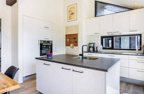 Layout: Kitchen(stove(induction), coffee machine, oven, microwave, dishwasher, fridge, freezer(200-249L)), Living/bed room(TV(german television channels, danish TV channels (DR1 and TV2), norvegian TV channels , swedish TV channels), gas fireplace), bedroom(2x single bed), bedroom(double bed), bedroom(double bed), bedroom(double bed, bunk bed), bathroom(tumble dryer, washbasin, shower, toilet, washing machine), bathroom(washbasin, shower, toilet), bath tub(outside, heated, 6 persons), shower(outside), sauna(outside, 6 persons), heating(electric), terrace, garden furniture, sun loungers, play equipment, air to water heatpump