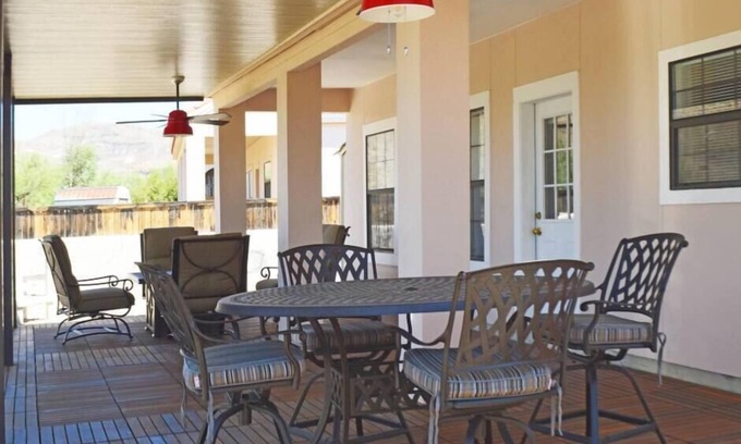 The house is a two-bedroom, two bath luxury condominium with a comfortable living room, dining area, fully stocked kitchen, laundry room, and an amazing backyard with a shaded porch, fire features, four person hot-tub, and breathtaking views of the Rio Grande, mountains, and into Mexico.