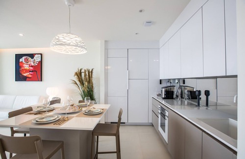 The apartment features a fully equipped gourmet kitchen, complete with top-of-the-line appliances and sleek countertops. Prepare culinary masterpieces or indulge in casual meals while enjoying the magnificent beach view that serves as your culinary inspiration. The kitchen provides both functionality and style, ensuring that every meal preparation is a pleasurable experience.