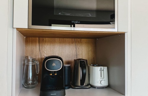 The fully equipped kitchen includes an oven, a microwave, a dishwasher, a wine cellar, an ice machine and a coffee machine with pods.