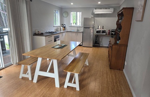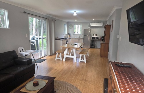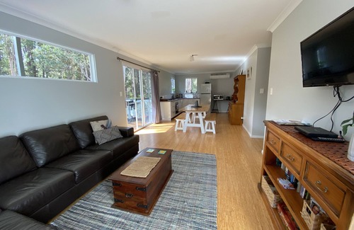 The beautiful bush surrounds the chalet and provides a private, tranquil location yet so close to town. Walking distance! We have another home on the other side of the property, which is also available to book. There is a spacious decking area overlooking the bush and grass area that is frequently visited by kangaroos.