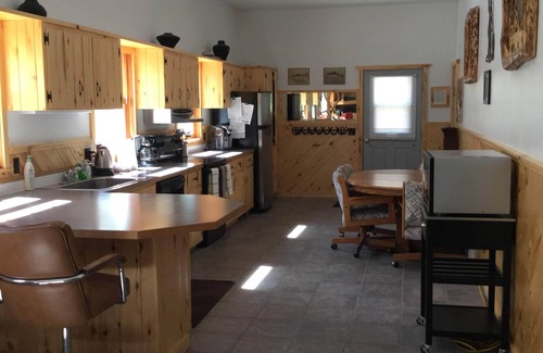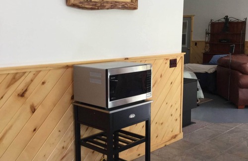 The big red barn is hand crafted with a large open floor plan with 9 foot ceilings. There is 1 main bedroom, and 2 Full bathrooms. The open area sleeps 4-6 in family style arrangements. There is a large kitchen equipped with everything you need, including fridge, microwave, cookware and a BBQ grill on the front porch.