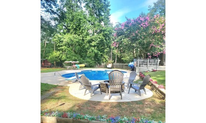 Very tranquil quiet area to sit outside in front of guest house and connect with nature. Enjoy the private fenced yard from neighbors to sunbathing in big lounge chairs next to pool or relaxing swinging in hammock. Enjoy a campfire at the fire pit. Perfect 9' foot pool with diving board that's always clean, If you don't want to swim or not comfortable with deep end, go to shallow end (3' feet) to just float around the pool on provided pool floats chairs. *Pool is not heated.