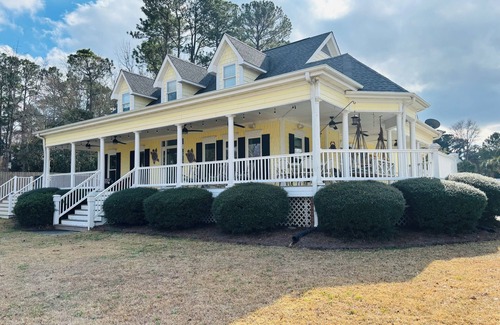 A lovely low country setting in Wilmington at this 3-bedroom/3.5 bath house located just behind Figure 8 Island and 7 miles from Wrightsville Beach. The primary bedroom features a king size bed and black out curtains with each additional bedroom featuring queen beds, ensuring a good night's sleep for all guests. With amenities like AC, heating, Wi-Fi, washer/dryer, in-ground pool, jacuzzi, outdoor shower, fire pit, putting green, pool table and a breath taking view from the wrap around porch with plenty of places to lounge while overlooking Pages Creek, your stay will be stress-free. The baths come equipped with hair dryers and showers for added comfort. Kickback, relax, and enjoy everything Wilmington and our enchanting house has to offer.