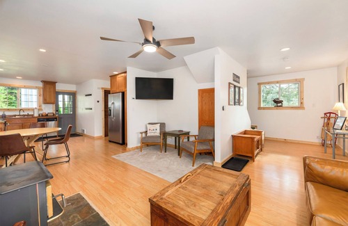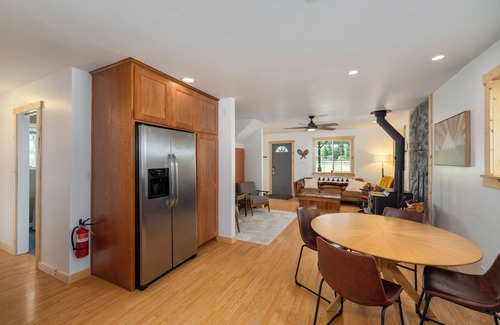 This cozy cottage is dog friendly and sleeps 6 guests with 1 bedroom with a king bed, one bedroom with a queen bed, sleeping loft with two twin beds, a blow-up air mattress with comfy foam pad, a fully equipped kitchen, hot tub, wood burning fireplace, sleds, and Snowshoes available for guests. In the summer we have a nice peaceful back yard with a fire pit, croquet, and horseshoes. Enjoy the hot tub under the stars or BBQ on our private deck. There is something for everyone to enjoy!
