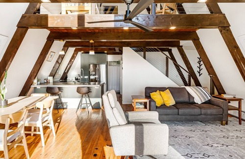Lake Champlain views! Private, peaceful and renovated A-Frame close to Burlington. Sleeps 8. Cozy, warm & modern. Outdoor shower. Reliable internet!