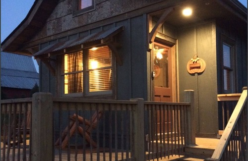 We built the cabin of 600 square feet, from the ground up with you, our guest in mind. A rustic old-style home with modern convenience. The style uses old barn wood, popular tree bark, rusty metal and 100-year-old tobacco sticks on the deck. We used 5 panel doors from the 1920s and finished the floors with hickory and oak hardwoods. Many of these items we collected over years and held in our barn just in case… and they are perfect for this guest cabin.