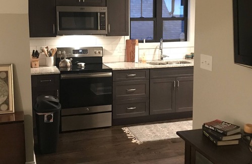 This is a modern, clean apartment: bedroom (with a king bed), full kitchen, full bath, and living room. The apartment is above a detached oversized double garage that’s heated/cooled. There is a separate private entrance with security cameras. The apartment has plenty of parking. The full kitchen includes cooking hardware, microwave, stove, oven, refrigerator, coffee pot, and dishwasher. Dedicated laundry with a new washer and dryer.